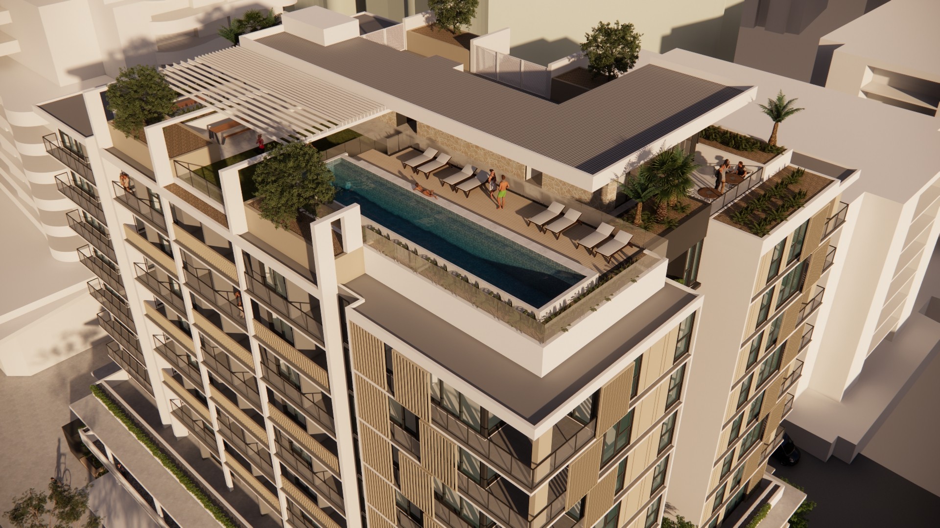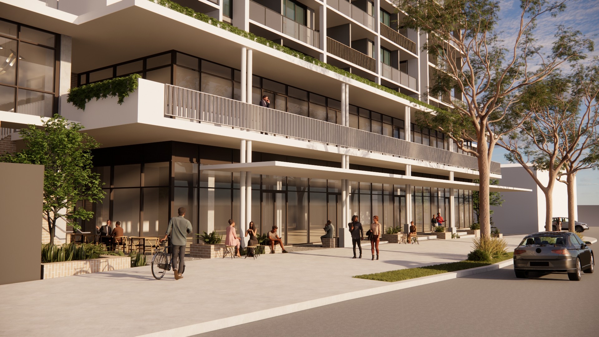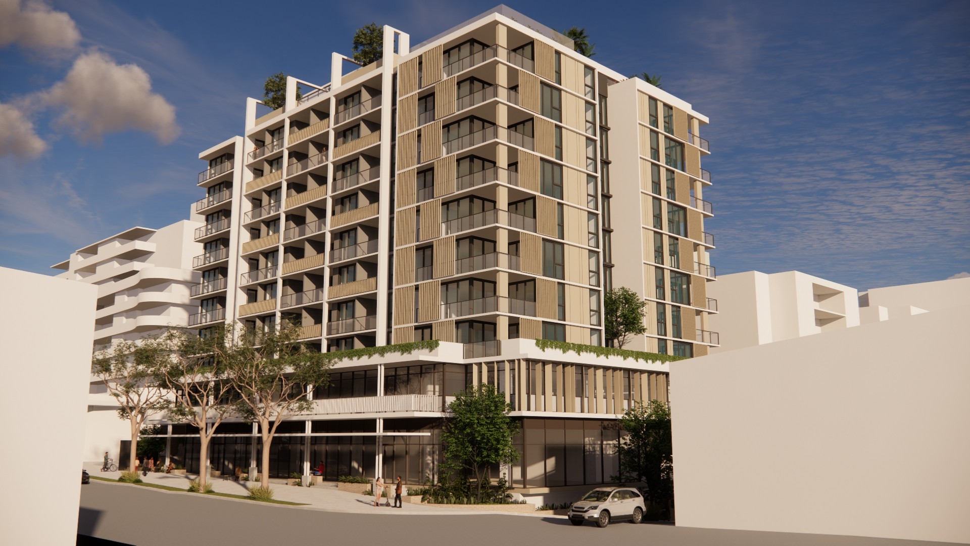 This 10-storey mixed-use development proposes a practical combination of ground-floor retail (584m2), upper-level commercial space (1,280m2), and a tower with 96 build-to-rent apartments (1, 2, and 3 bedrooms). The project aims to meet the demand for housing with quality livable dwellings and exemplary communal amenity. The design focuses on a clear podium/tower structure, featuring distinct retail and office spaces, with private balconies for each residential unit.